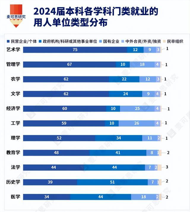 其实想进体制内,选对专业比努力更重要!《2025年中国本科生就业报告》早就给出了明确答案,不同学科毕业生的就业方向差异极大:艺术学、管理学、农学等学科,大多去了民营企业;而医学、历史学、法学、教育学这几类,毕业生更多进入政府机构、事业单位,体制内就业比例远超其他专业。